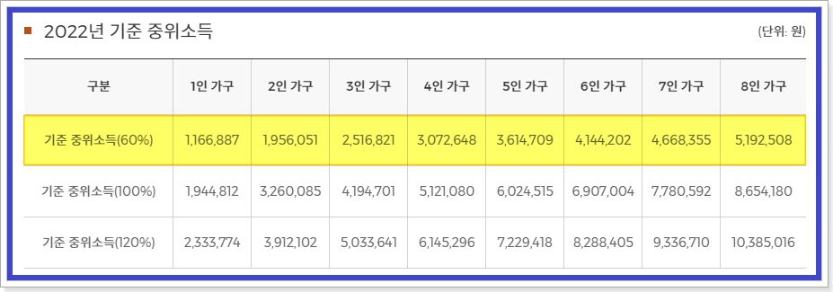 여기서 제일 중요한 점을 꼽으라면 당연히 중위소득 기준에 해당하느냐 안 하느냐겠죠. 아마 중위소득 60%를 어떻게 계산하면 좋겠냐는 분들이 계실 텐데요. 중위소득은 여러분이 직접 계산하실 필요가 없습니다.