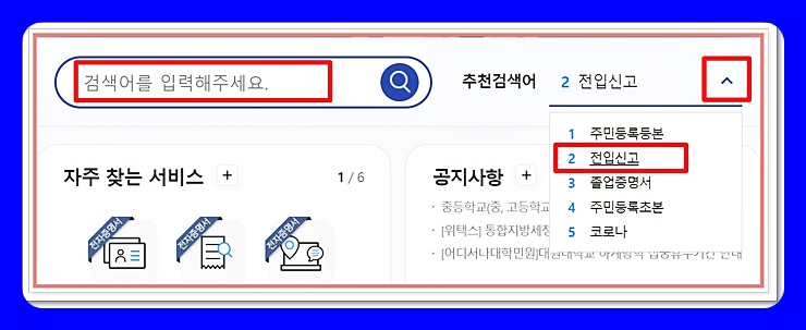 만약 한 글자도 치기 귀찮다 하시는 분은요. 오른쪽에 추천검색어를 활용해 보세요. 화살표 버튼을 누르면 국민들이 자주 사용하는 메뉴 5가지가 뜨는데요. 전입신고가 2위에 떠 있는 것을 볼 수 있습니다. '전입신고'를 누르면 바로 메뉴로 이동합니다.