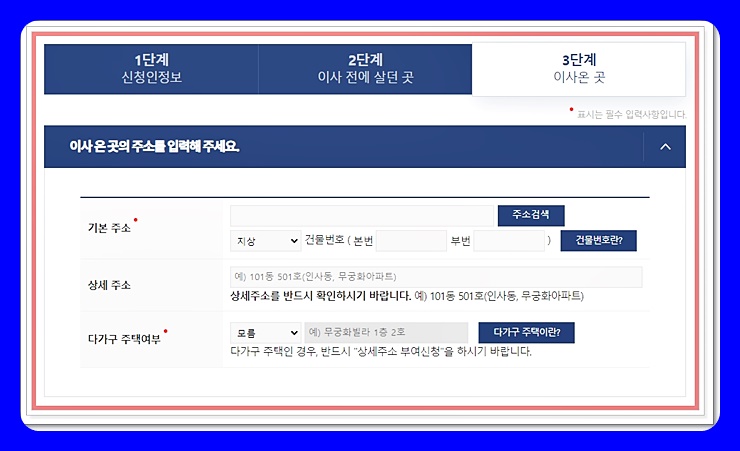 마지막 3단계입니다. 이 부분이 조금 까다로울 수 있는데요. 새로 이사 간 곳의 주소를 먼저 입력해 줍니다. 여기까지는 어렵지 않으실 거예요.