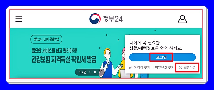 메인 홈페이지에 들어가면 우측 상단에 로그인 화면이 뜹니다. 이미 공동인증서를 등록하신 분은 로그인을 눌러 바로 진행해 주시구요. 만약 처음 방문하신다면 바로 아래쪽의 '회원가입'을 눌러 가입을 마쳐 주시기 바랍니다.