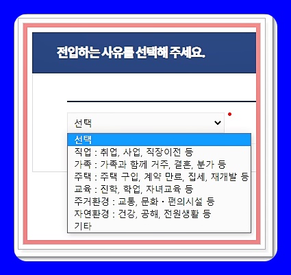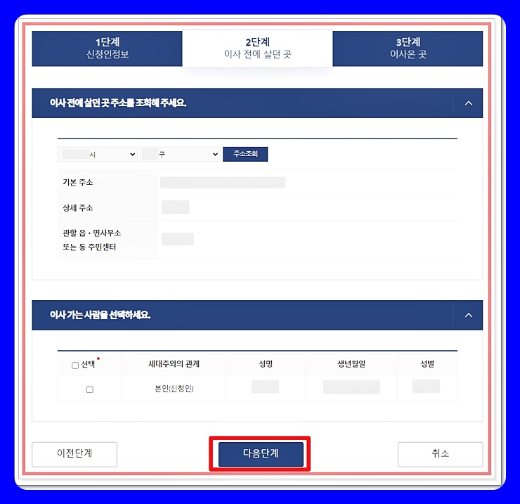 2단계인 '이사 전에 살던 곳'도 작성이 금방 끝납니다. 본인이 이사오기 전에 살았던 곳의 시와 구를 선택하면 모든 자료가 자동으로 입력되기 때문인데요.