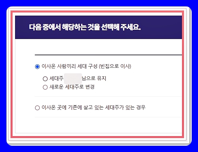 그다음에 나오는 선택지가 조금 까다롭습니다. 빈집으로 이사하느냐, 아니면 기존에 세대주가 있는 집으로 이사하느냐에 따라 선택지가 달라지는데요. 각 선택지를 클릭하면 입력할 정보들이 나옵니다.