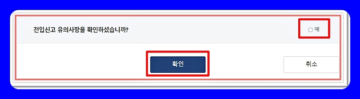 위의 유의사항들을 모두 확인하셨나요? 그러면 이제 본격적으로 인터넷 전입신고를 진행할 차례입니다. 위의 유의사항을 모두 읽고 나면 화면을 아래로 이동하세요. 그리고 '예' 버튼과 '확인' 버튼을 눌러 줍니다.