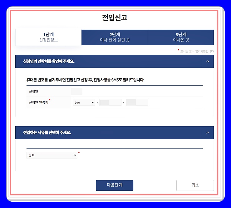 1단계 신청인 정보 작성은 쉽습니다. 본인의 이름과 연락처, 그리고 전입하려는 사유를 선택하면 되는데요. 전입사유는 취업, 분가, 계약 만료, 진학 등등 본인의 사정에 맞게 선택하세요.