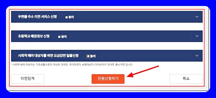 이사를 함과 동시에 우편물 주소 이전 서비스, 초등학교 배정정보 등 부가서비스를 신청하시고요. 맨 아래쪽의 '민원신청하기'를 눌러 인터넷 전입신고를 마쳐 줍니다.