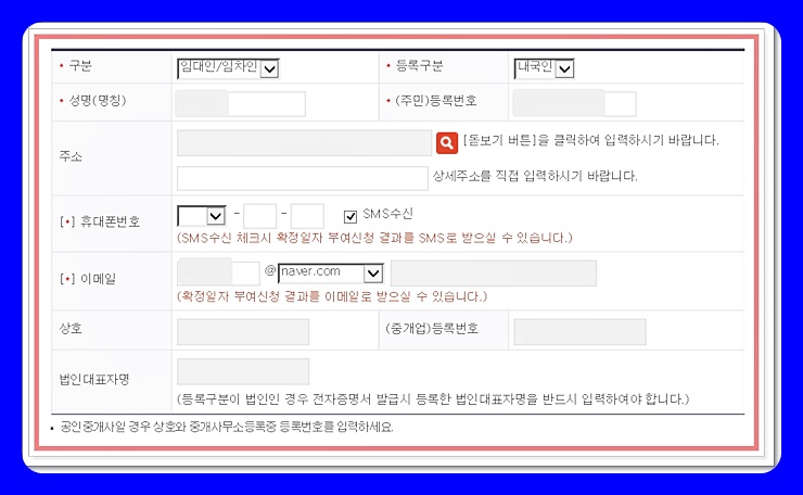 이제 확정일자 인터넷 등기소 이용 절차가 거의 다 끝났습니다. 마지막으로 지금 이 신청서를 작성하고 있는 본인의 개인정보를 입력해 줍니다. 이름, 주민등록번호, 휴대폰번호, 이메일만 입력해 주면 끝입니다.