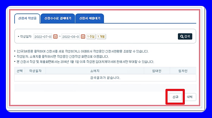 다음 화면으로 넘어가면 '검색결과가 없습니다'라는 내용이 나오는데요. 당황하지 마시고 오른쪽 하단의 '신규' 버튼을 누르시기 바랍니다.