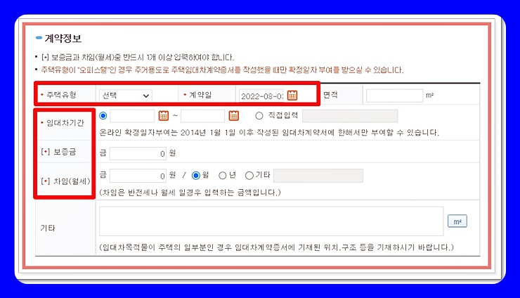 이제 계약과 관련된 내용을 입력해 줍니다. 주택유형, 계약일, 임대차기간, 보증금 또는 월세는 필수 입력사항입니다. 계약서에 적힌 내용을 그대로 적어 주시면 됩니다.