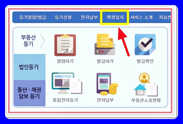 로그인을 완료했다면 상단에 뜨는 메뉴 중에서 '확정일자'를 눌러 줍니다.