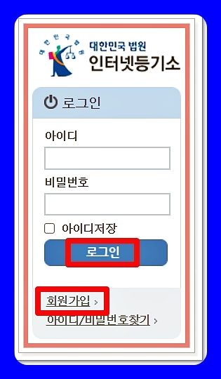 너무 당연한 얘기지만, 확정일자 인터넷 신청을 위해서는 인터넷등기소 회원가입이 필요합니다. 저처럼 기존 아이디가 있는 분은 바로 로그인을 하시면 되고요.