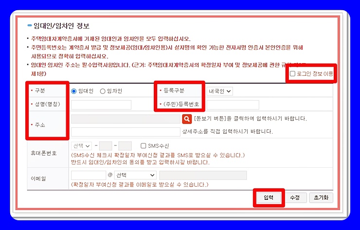 오른쪽의 '로그인 정보 이용'을 누르면 본인의 정보가 바로 등록이 됩니다. 본인이 임대인인지 임차인인지 선택하시구요. 개인정보를 입력해 줍니다. 마지막으로 '입력' 버튼을 누르면 본인의 정보가 등록됩니다.