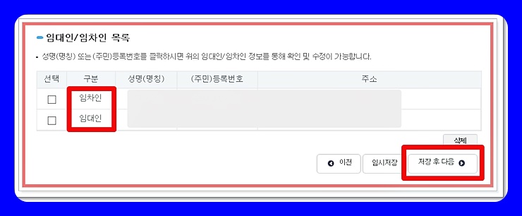 임차인과 임대인이 모두 등록되었는지 확인 후, '저장 후 다음'을 누릅니다.